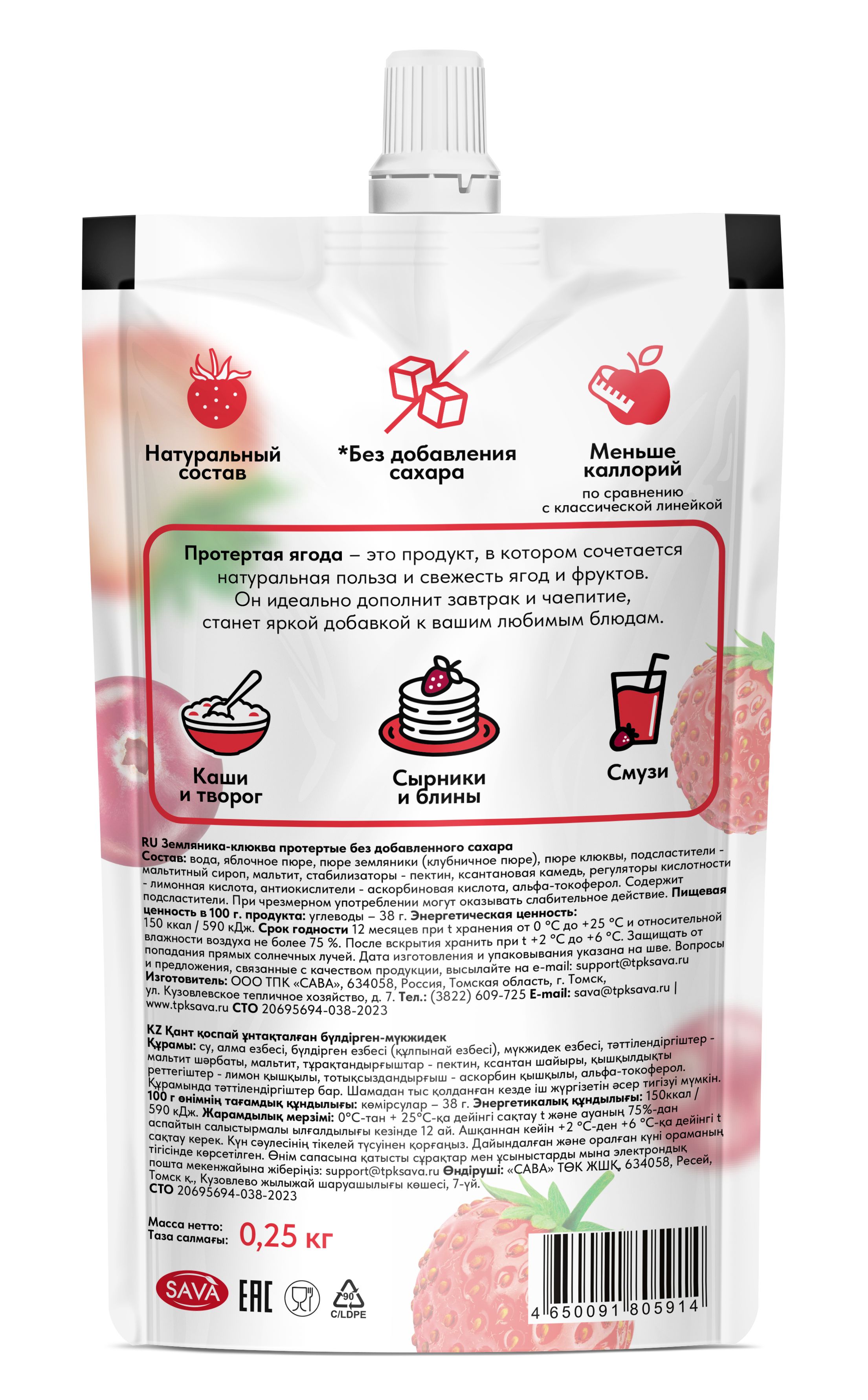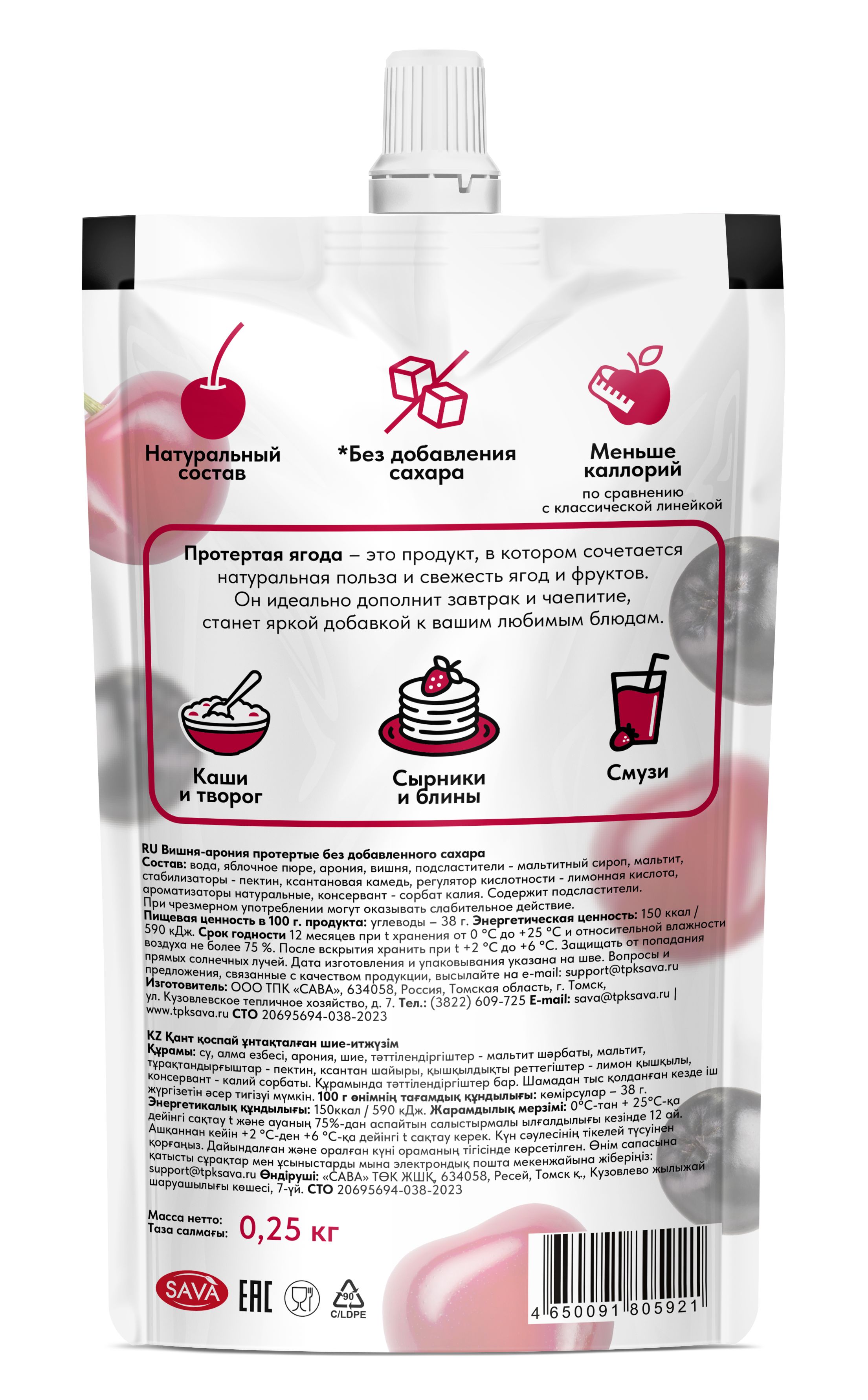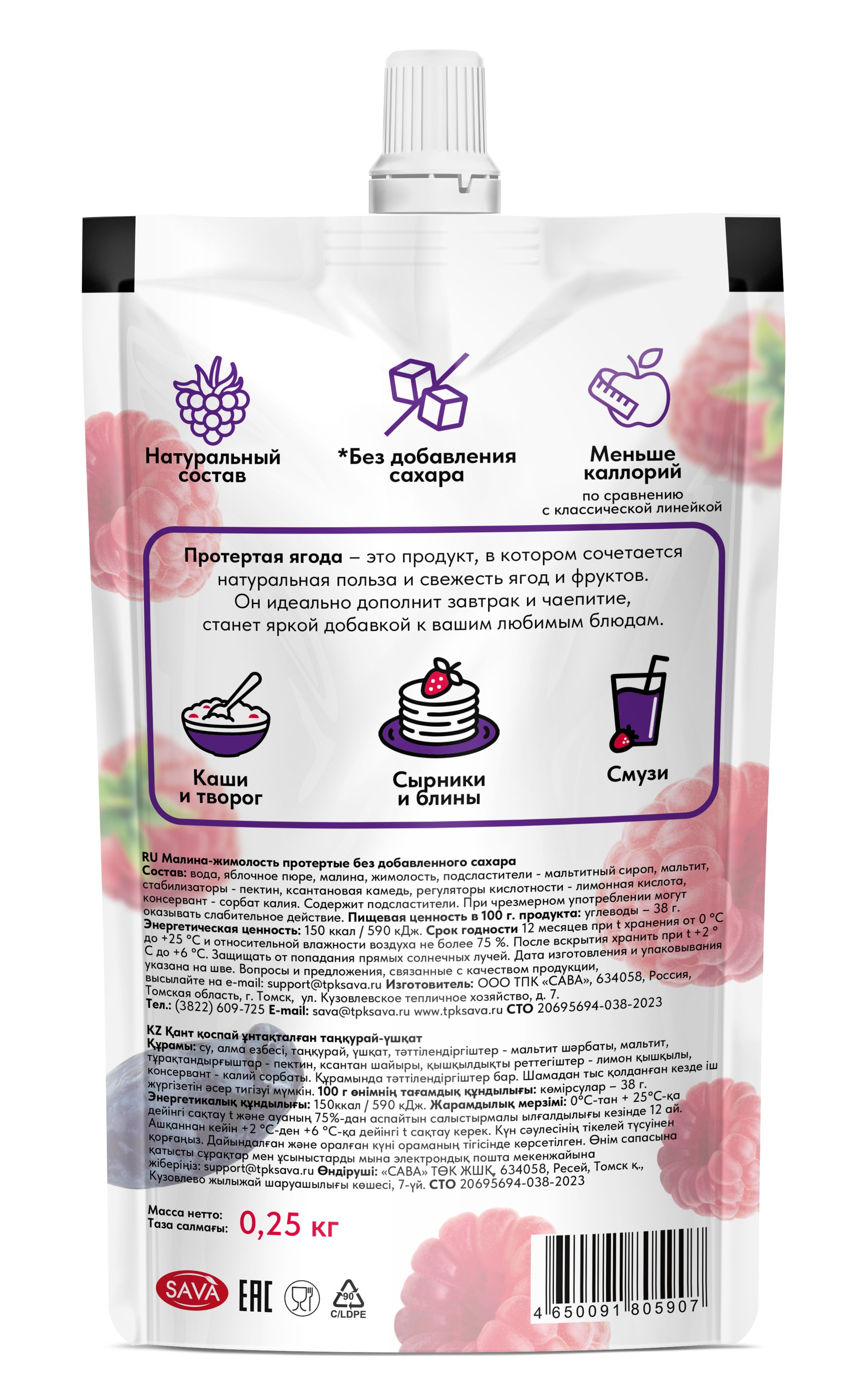 Протертая ягода - это продукт, в котором сочетается натуральная польза и свежесть ягод и фрукт. Натуральное ягодное пюре без добавления сахара, консервантов и загустителей. Джем сохраняет естественный вкус и аромат ягод. Он идеально дополнит завтрак и чаепитие, станет яркой добавкой к вашим любимым блюдам. Без сахара — подходит для тех, кто следит за потреблением сахара или придерживается диеты. Варенье без сахара используют в каши, йогурты, выпечку, соусы, детское питание и десерты. Удобная текстура — готово к использованию, не нужно измельчать или протирать. Джем без сахара низкокалорийный имеет абсолютно натуральный состав, не содержит сахара, поэтому менее калорийный по сравнению с аналогами.