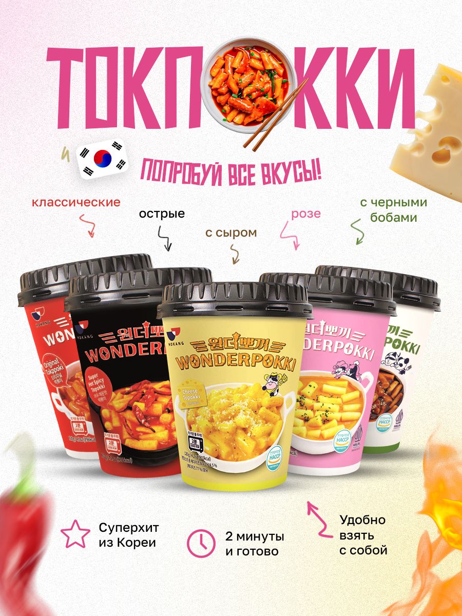 Пятикомпонентный набор корейская еда быстрого приготовления токпоки, включающий оригинальные палочки и четыре ярких соуса: Розе, Черные Бобы, Жгучая Курица и Сыр. Каждый кусочек — это открытие новой грани корейской кухни и возможность насладиться разнообразием насыщенных вкусовых оттенков. Идеально для романтического ужина, дружеской вечеринки или просто для тех, кто любит экспериментировать и азиатскую еду!