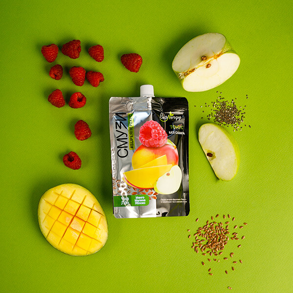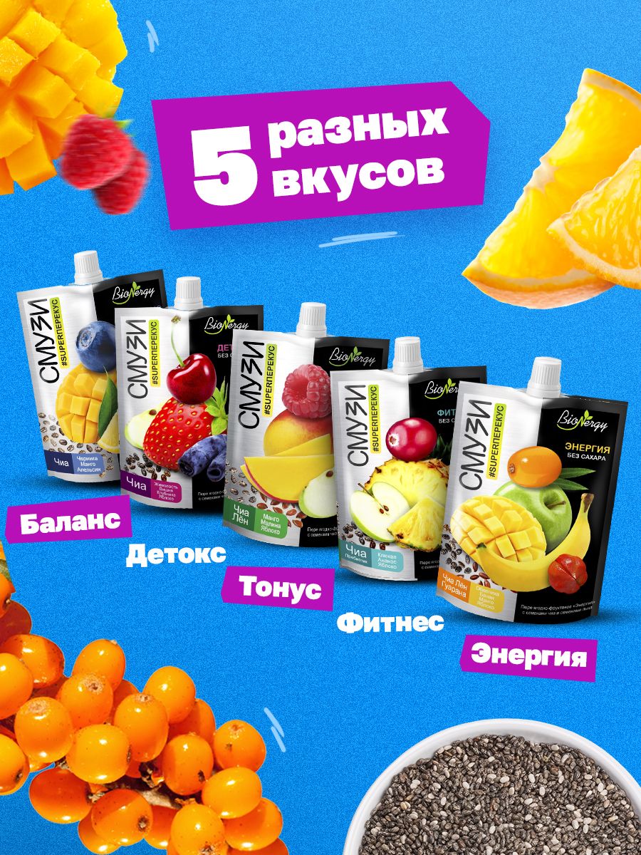 Смузи – это яркий микс из ягод, фруктов и семян, который быстро насытит организм энергией для покорения новых вершин! Удобный формат, который легко можно взять с собой, отсутствие сахара и натуральные компоненты в составе делают этот продут идеальным полезным перекусом на каждый день.