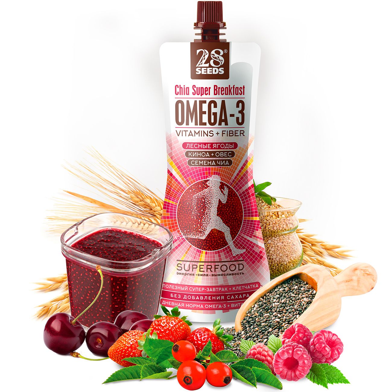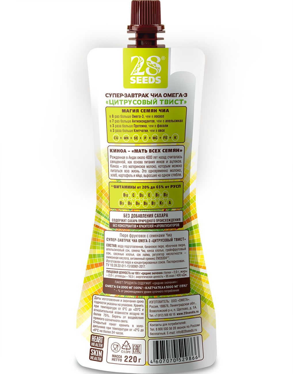 Содержит киноа - «мать всех семян», рожденная в Андах около 4000 лет назад считалась священной, как основа питания инков и ацтеков. Киноа — это материнское молоко, котором можно питаться всю жизнь. Это превосходный источник растительного цельного белка, который отлично усваивается.