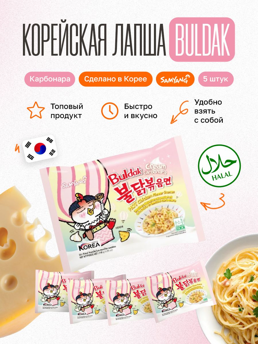 Корейская лапша Buldak Samyang с острой курицей и сливочным соусом карбонара (5 шт по 140 г) — уникальное сочетание яркой корейской остроты и бархатистой сливочной нежности итальянской карбонары. Каждая порция — это 140 грамм идеально приготовленной пшеничной лапши с насыщенным острым соусом из жареной курицы, гармонично дополненным сливочным соусом карбонара, который смягчает огненный вкус и добавляет блюду глубину и сливочную текстуру.