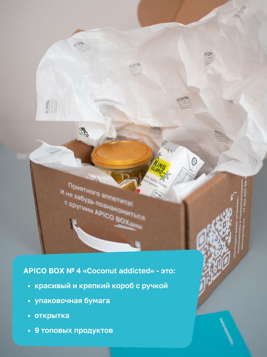 Привет! Я подарочный набор APICO BOX. Я помогаю не тратить время на поиск интересных, вкусных и полезных продуктов. Они уже собраны специально для тебя. APICO BOX №4 «Coconut addicted» - это набор для тех, кто обожает вкус кокоса и все то, что приготовлено на его основе. В боксе собраны топовые вкусные и полезные продукты, которые точно стоят того, чтобы их попробовать. В состав этого бокса входят: 1.Кокосовое масло Roi Thai 2.Кокосовая вода без сахара KING ISLAND, 250 мл 3.Chaokoh Кокосовые сливки Растительные 250мл 4.Кокосовое молоко Monkey Island, натуральный напиток из мякоти спелого кокоса, 250мл 5.Кокосовое молоко Roi Thai, 250 мл 6.Кокосовая сгущенка Chaokoh на основе кокосовой мякоти, 330 г 7.Шоколадная паста с орехом макадамия и кокосом King Island, 290 г APICO BOX – это отличная идея для подарка себе, своим близким, друзьям или знакомым. Можно выбрать любой из предложенных вариантов и не сомневаться в качестве и вкусе продуктов. Приятного аппетита! И не забудь познакомиться со всеми APICO BOXами: APICO BOX №1 «Ит Таиланда with love» APICO BOX №2 «VEGALIZE» APICO BOX №3 «Том Ям Lovers club» APICO BOX №4 «Coconut addicted» APICO BOX №5 «Без сахара» APICO BOX №6 «Без глютена» APICO BOX №7 «Из Сибири с любовью» APICO BOX №8 «Ассорти тайских соусов» APICO BOX №9 «Смузимания»