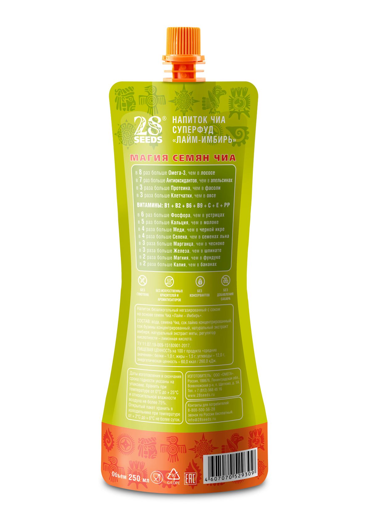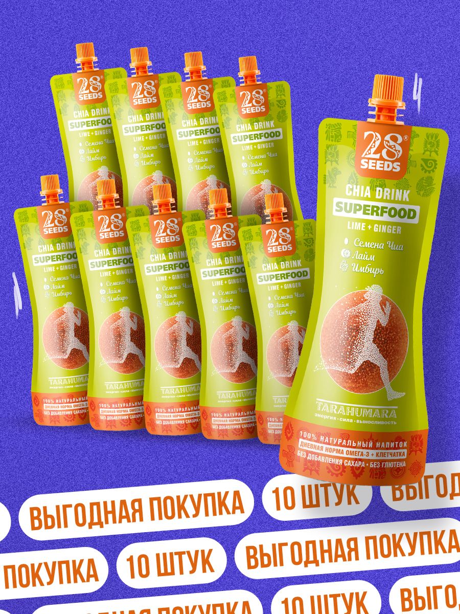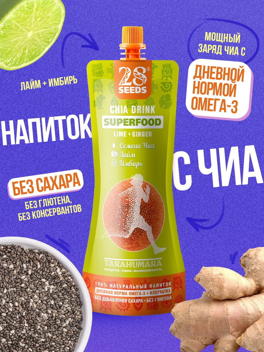 Напиток Чиа 28SEEDS, смузи без сахара СУПЕРФУД Лайм - Имбирь, 10 шт, напитки пп