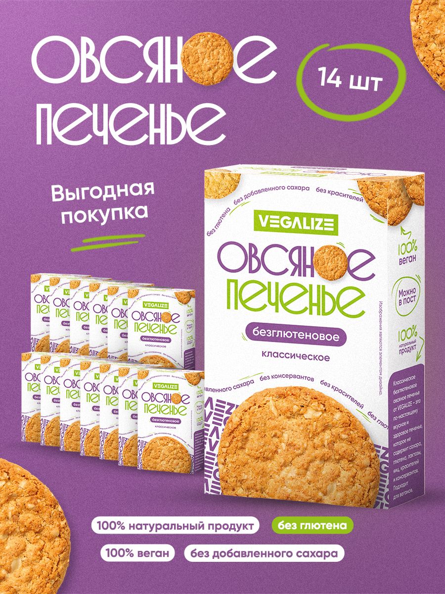 Классическое безглютеновое овсяное печенье от VEGALIZE - это по-настоящему вкусное и здоровое печенье, которое не содержит сахара, глютена, лактозы, яиц, красителей и консервантов. Подходит для веганов. Здоровье, польза и красота в каждой пачке.