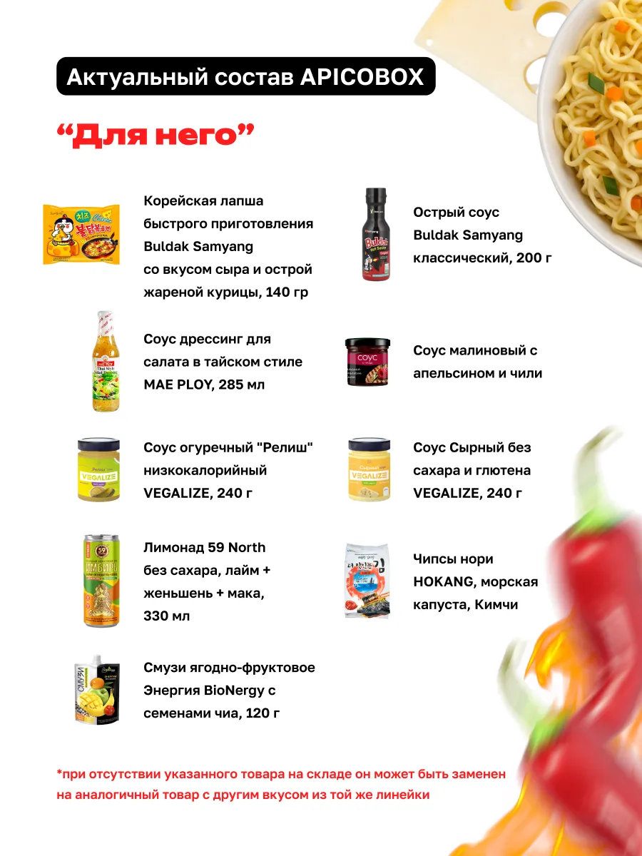 Хотите разнообразить рацион насыщенными вкусами и полезными продуктами? В нашем наборе — гармоничное сочетание пикантных соусов, хрустящих снеков, освежающих напитков и питательных смузи. Здесь найдётся и драйв для любителей острого, и забота о здоровье для приверженцев осознанного питания.