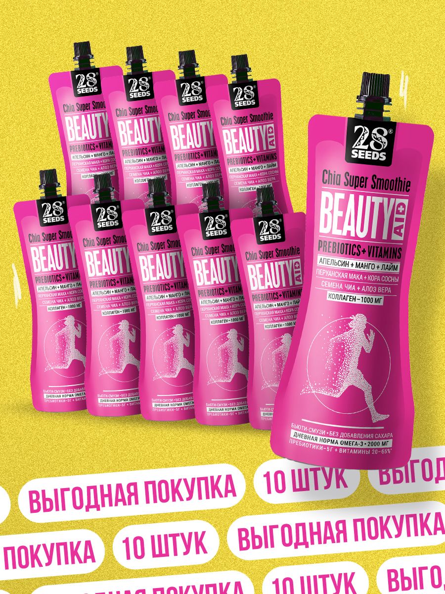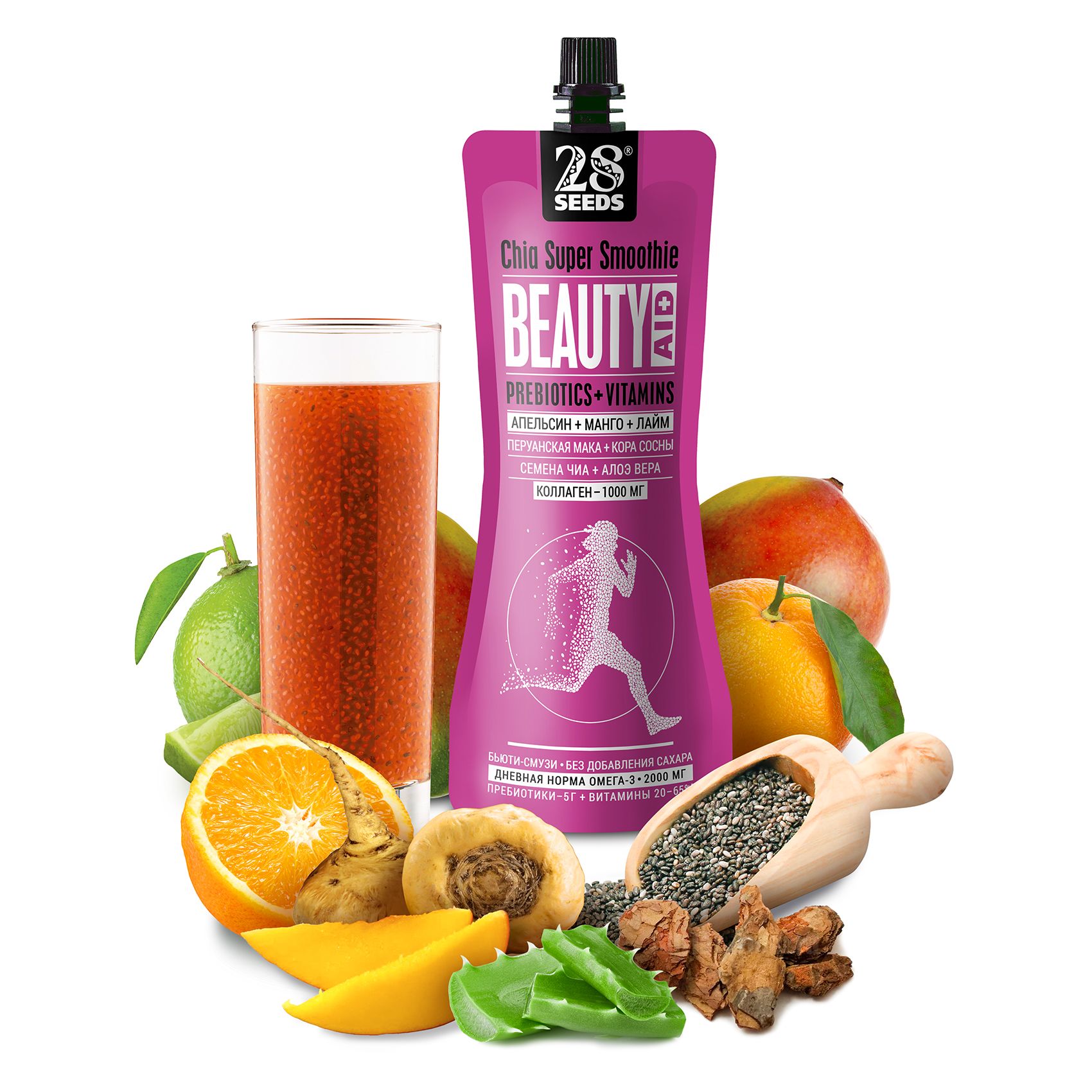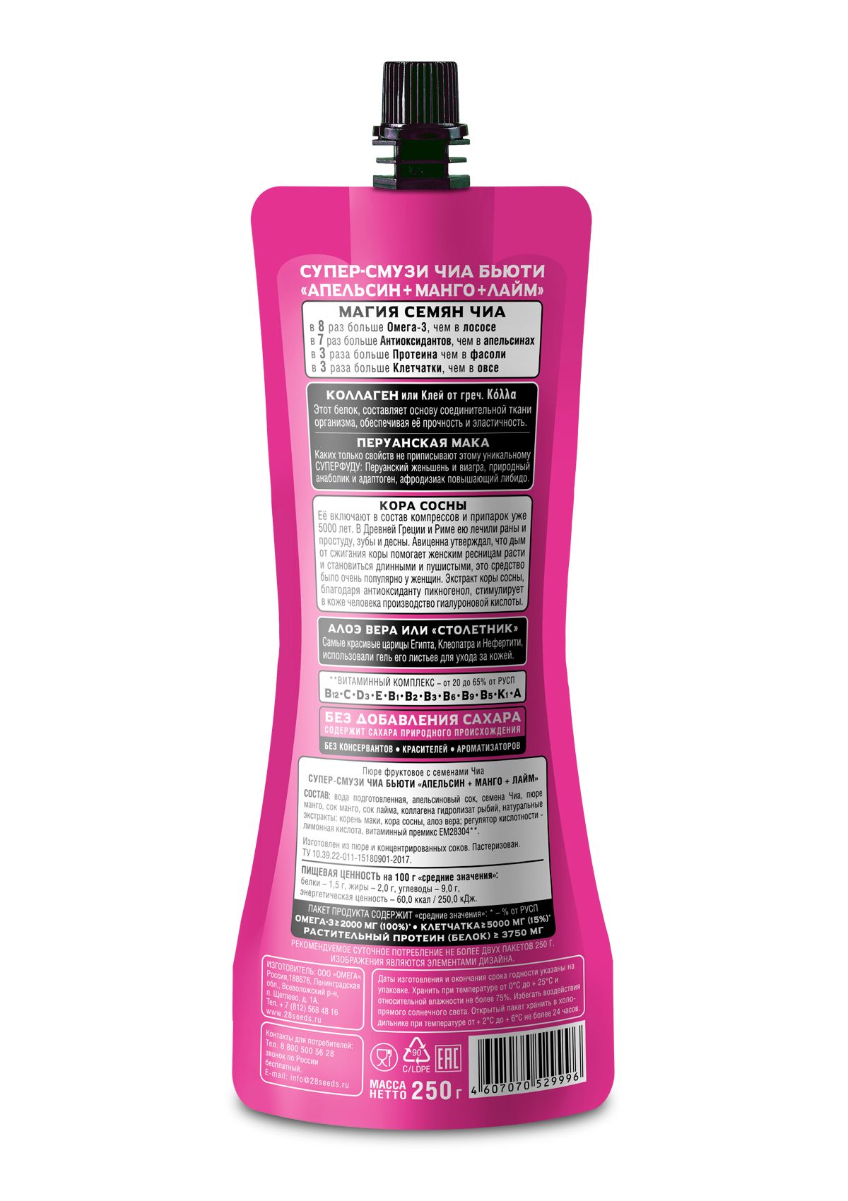 Комплекс натуральных ингредиентов способствует омоложению кожи и всех тканей организма, волос, ногтей, придает зубам и костям прочность, помогает поддерживать гормональный баланс и повышает общий тонус, энергетик без сахара. Один пакет смузи без сахара содержит Омега 3, клетчастку и протеины, а также другие полезные ингредиенты: коллаген, мака перуанская, кора сосны, алоэ вера, чиа