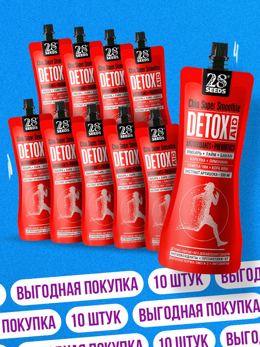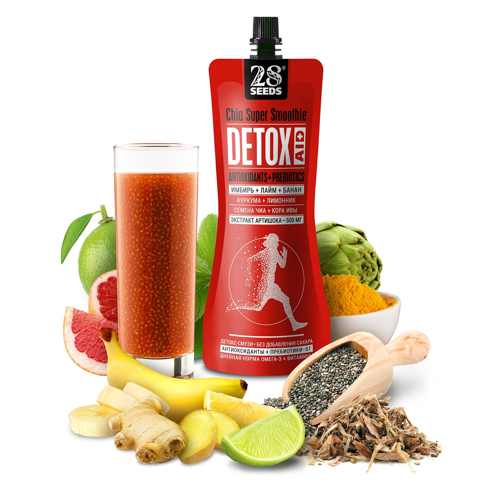 Природные ингредиенты в составе смузи без сахара, обладают мощным оздоровительным эффектом, улучшают обмен веществ, нормализуют пищеварение, поддерживают работу сердца, защищают печень и укрепляют иммунитет, энергетик без сахара. Один пакет содержит Омега3, клетчатку, протеин, а также другие полезные ингредиенты: артишок, имбирь, куркума, ива, лимонник, чиа