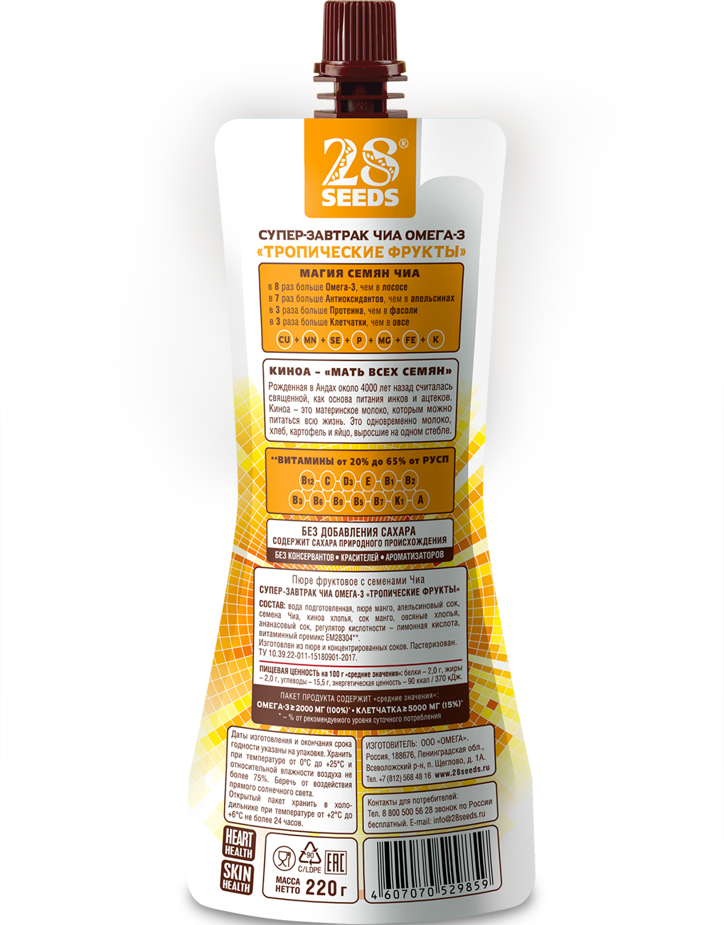 Содержит киноа - «мать всех семян», рожденная в Андах около 4000 лет назад считалась священной, как основа питания инков и ацтеков. Киноа — это материнское молоко, котором можно питаться всю жизнь. Это превосходный источник растительного цельного белка, который отлично усваивается.