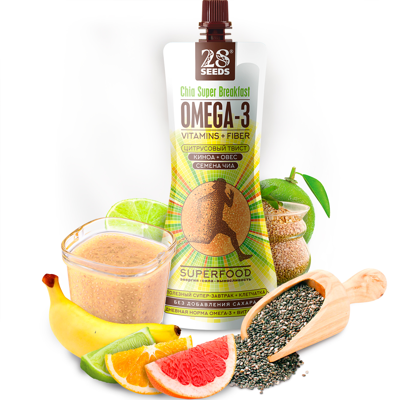Магия семян чиа: в 8 раз больше Омега-3, чем в лососе; в 7 раз больше Антиоксидантов, чем в апельсинах; в 3 раза больше протеина, чем в фасоли; в 3 раза больше клетчатки, чем в овсе.