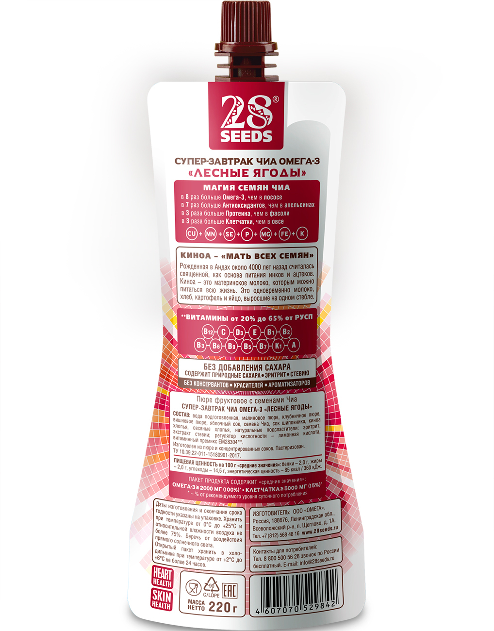 Содержит киноа - «мать всех семян», рожденная в Андах около 4000 лет назад считалась священной, как основа питания инков и ацтеков. Киноа — это материнское молоко, котором можно питаться всю жизнь. Это превосходный источник растительного цельного белка, который отлично усваивается.